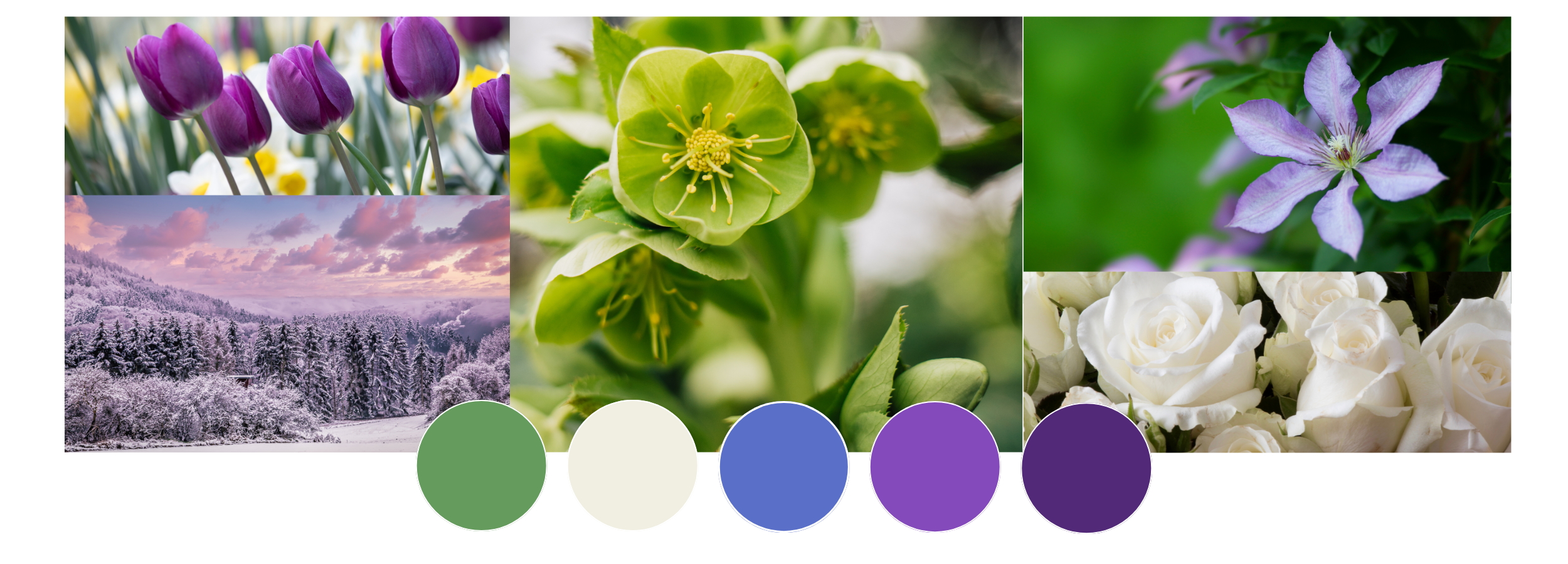 Bright but wintery, January's palette offers a pick me up during this cold dark month, with bright greens, wintery whites, a range of purples, and accents of blue.