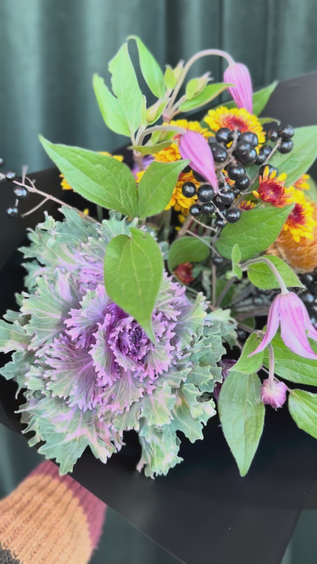 A special spooky season petite bouquet, featuring longer lasting blooms in our October flower palette.
